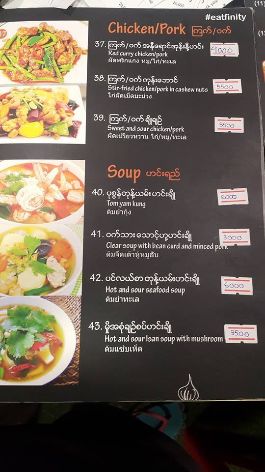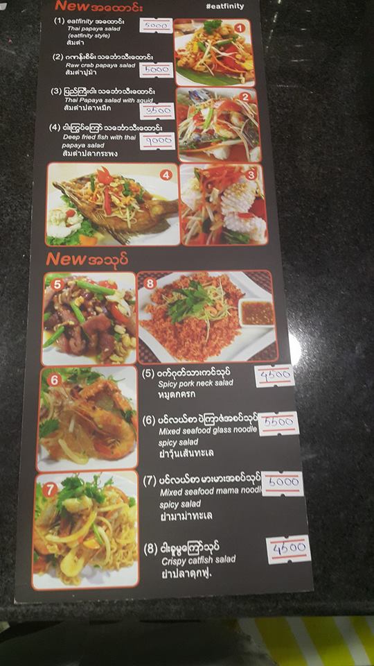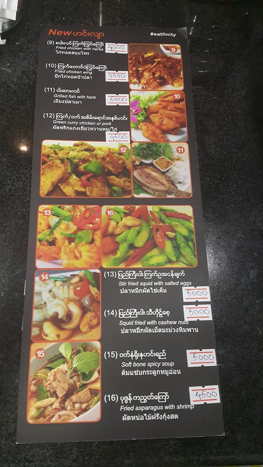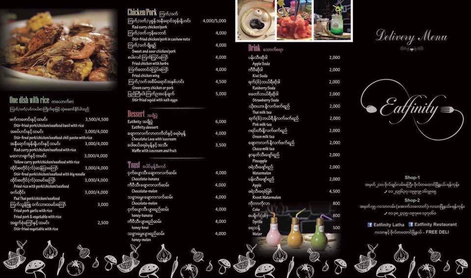 Eatfininty Restaurant is conveniently located at No.210, Bogyoke Street, Botahtaung Township, Yangon and was started on August, 2016.The shop decoration and furniture are stylish, nice, clean, tidy and the wall are decorated by amazing picture that are very interesting and to take a photo or selfie.It features variety of delicious Thai Food that are prepared by experience Thai Chef.