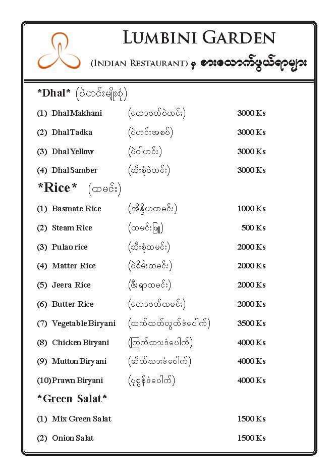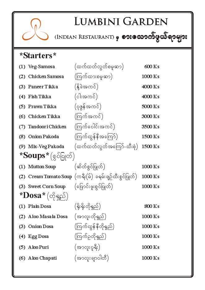 The beginning journey to Indian taste.Lumbini Garden restaurant is located in 40/A,Thadipahtan st,Kyauk Myaung,Tarmwe Tsp,Yangon.